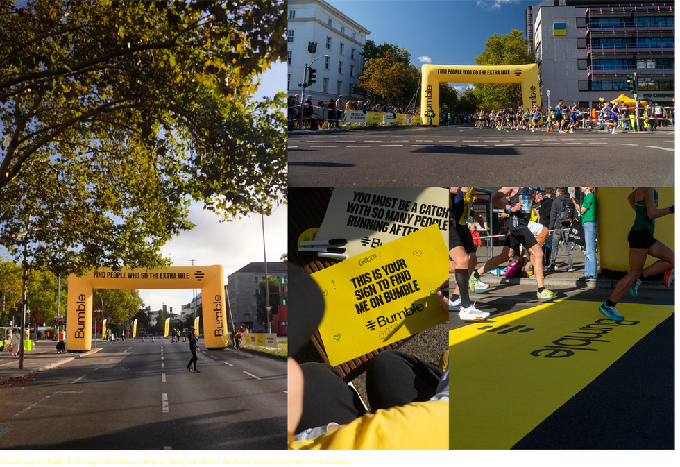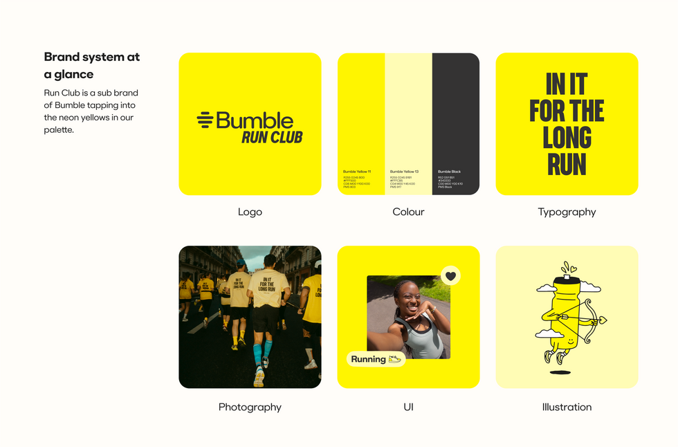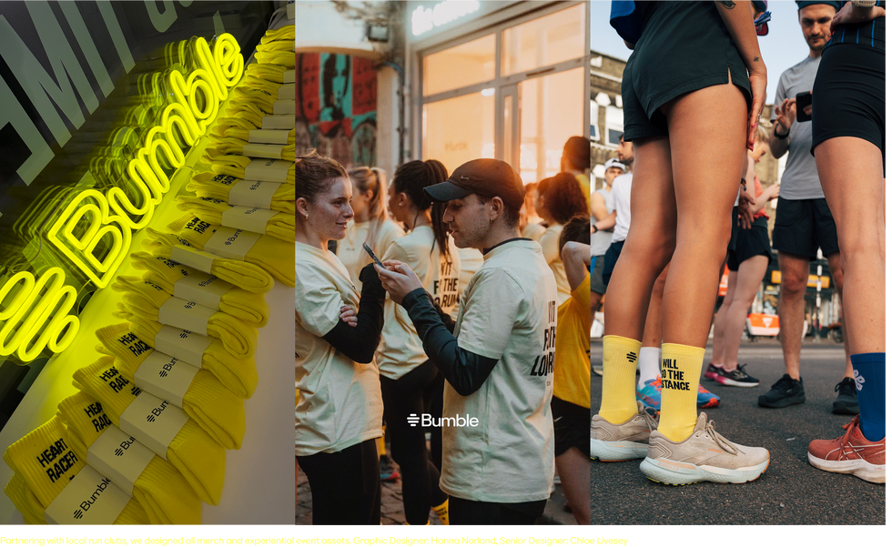 Create a sub-brand of our new Bumble identity by tapping into the neon yellows, to channel the high-energy run aesthetic. We positioned Bumble Run Club as more than a running event, it was a new way to date. I created a visual system that flexed across local markets and live activations. From bespoke merch and marathon moments to city takeovers and digital content, we made Run Club feel like a lifestyle, open & inclusive. In 2025, I commissioned an external illustrator to push the creative system further and keep the brand fresh and resonant.